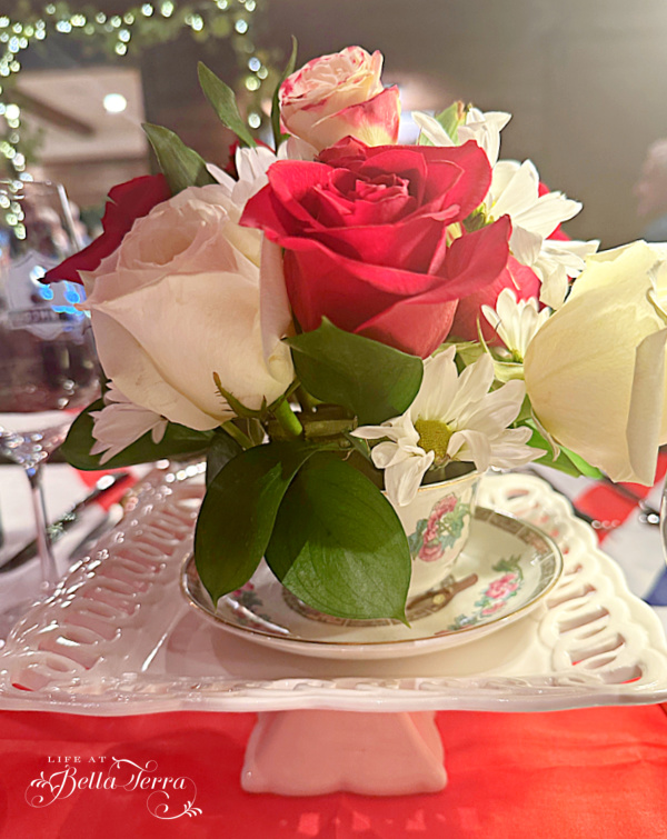 The centerpiece is a combination of vintage teacups filled with fresh roses, daisies, alstroemeria and greens. Some are set right on the table, others are elevated on small pedestal cake stands.