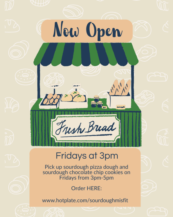 My friend and neighbor, Kelly, recently opened her micro bakery concept, called Sourdough Misfits. Currently, she is offering sourdough pizza crusts and the most delicious sourdough chocolate chip cookies every Friday from her home (which is walking distance from mine).