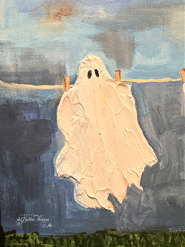 I actually like the three white ghosts on the white canvas (just need eyes), however, I decide to paint the background and make the ghosts look like they are hanging on a clothes line.