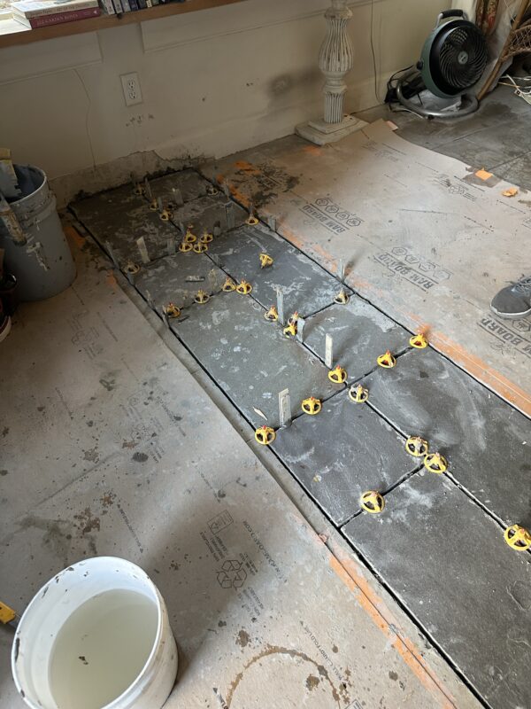 John has cut and laid the stone in the cut-out sections of the concrete floor. Grout will come next, then cleaning and sealing. No more electric surprises, so that’s good. I know Finn is very ready to get his “home” back too.