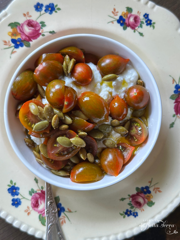 Lately, I’ve been enjoying a simple combination: cottage cheese (I prefer the lower fat variety), cherry tomatoes (currently heirloom chocolate drop cherry tomatoes from my garden), a drizzle of flax oil and a sprinkle of roasted pumpkin seeds. It provides about 25 grams of protein along with healthy fats.