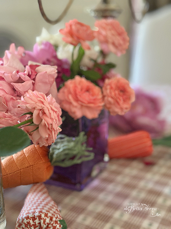 This year’s centerpiece came together effortlessly thanks to my rose garden, which is in full bloom. I clip a few roses for the table and tuck in some fabric carrots from Target’s dollar section for a whimsical touch.