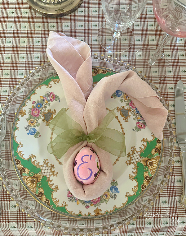 Since I am serving a breakfast buffet, there wasn’t really a need for a separate salad plate- as everyone tends to pile everything onto one. I add a playful touch by folding linen napkins into bunny ears and wrapping them around eggs painted with each guest’s initials. The beaded charger is an inexpensive purchase at Hobby Lobby.